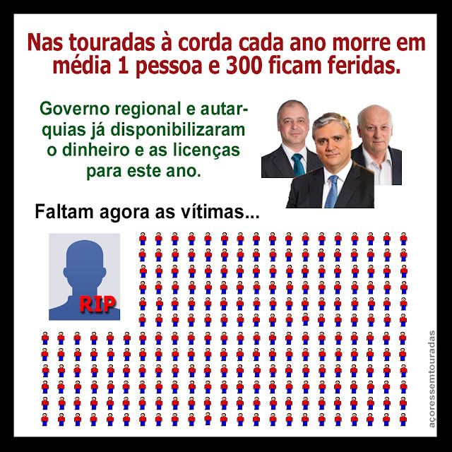 Os cidadãos açorianos perguntam-se até quando o dinheiro dos nossos impostos vai continuar a ser desviado para financiar a tortura de animais e para encher o bolso dos seus torturadores. Até quando o Governo Regional dos Açores e algumas autarquias vão continuar a apoiar e financiar espetáculos de sofrimento e de dor, onde se maltratam cruelmente animais inocentes.